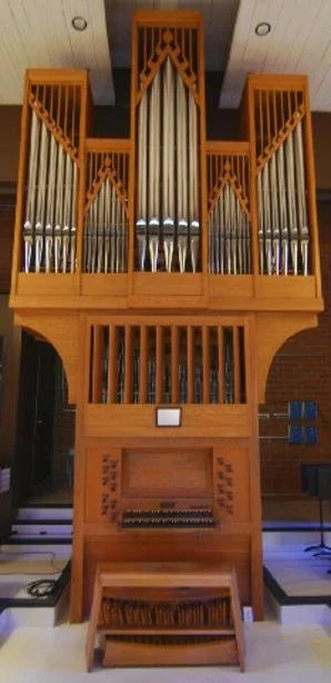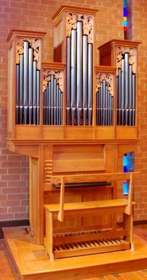 The free-standing wooden case housing the organ is open at the front and not only serves to protect the pipes but also blends the sound, imparts resonance of its own, and projects the sound of the organ toward the listener. The organ case, designed to be an integral and beautifying feature of the architecture the room, artistically reflects the integral and enhancing role of music in the worship service.